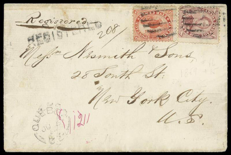 1867 (Jun. 6) Quebec, Canada to New York N.Y. Folded cover bearing Canada 5¢ vermilion, 10¢ purple (15, 16) tied by open circular grids, matching "Quebec C.E., JU 6 '67" rimless cds and "REGISTERED" straightline with ms. 208" number; cover refolded at top slightly affecting stamps, F.-V.F. Estimate; $200 - 300. US$200-300 (Image)