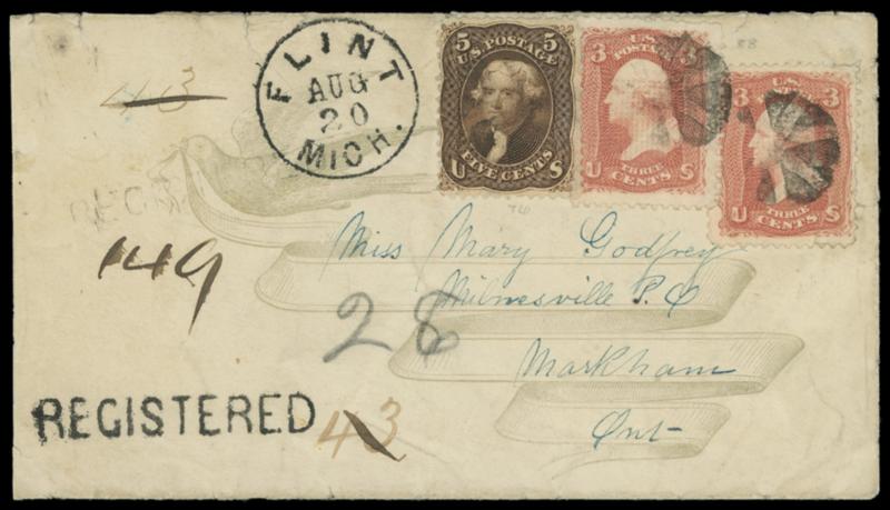 1868 (Aug. 20) Flint, Michigan to Milnesville, Ontario, Canada. Cover with dove and ribbon address panel bearing two 3¢ red, grilled (88) singles and 5¢ brown (76), tied by cork cancels duplexed with bold "Flint, Mich. Aug 20" cds, matching "REGISTERED" straightline and ms. "43" number, Toronto (8.21, 8.22) backstamps with light "Registered" straightline and ms. "149" registry number; small faults including sealed cover tears, reduced slightly at left, Fine appearance. Estimate; $500 - 750.