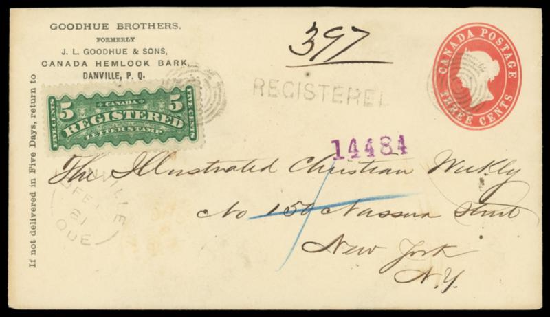 1881 (Feb. 1) Danville, Canada to New York N.Y. Registered Canada 3¢ red entire with Goodhue Brothers corner card bearing Registered, 5¢ green tied by seven-ring target cancels, matching "Danville, Que. FE 1 '81" rimless cds and "REGISTERED" straightline with ms. "397" number, reverse with Island Pond Vt. (2.3) transit and purple New York (2.5) arrival, fresh and Very Fine,ex-Lussey. Estimate; $200 - 300. US$200-300 (Image)