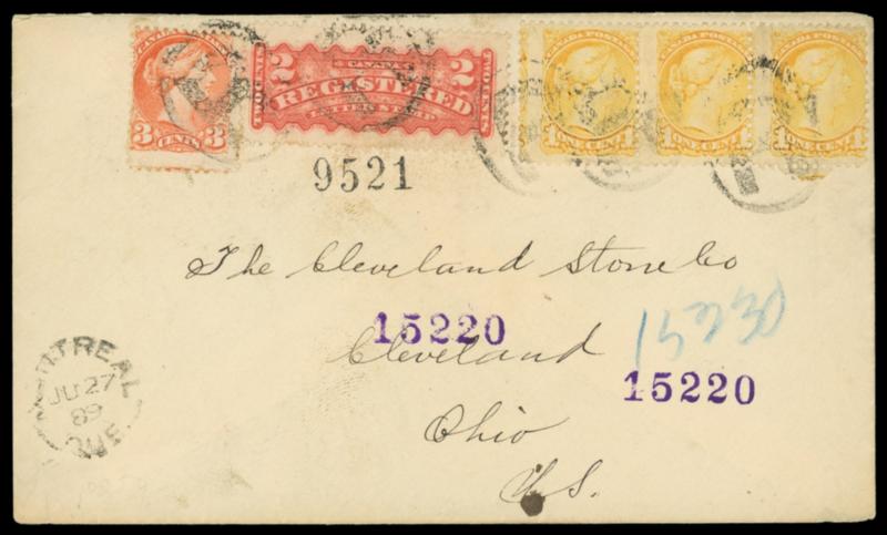 1889 (Jun. 27) Montreal, Canada to Cleveland, Ohio. Cover bearing Canada 1¢ yellow strip of three, 3¢ vermilion and Registered 2¢ red, each tied by "R" oval handstamp, matching "Montreal Que. JU 27 '89" rimless cds, reverse with "G.T. Ryt & K, R.P.O., West, No 1, JU 28 '89" and purple Buffalo (6.28) transits, various registry numbers, F.-V.F.,ex-Lussey. Estimate; $200 - 300. US$200-300 (Image)