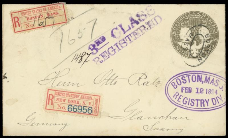 Registry Exchange Label, Boston, MA, printed name. Ms. "1651" number, affixed on 10¢ Columbian (U350) entire canceled by "Boston, Mass." oval, bold purple "Boston, Mass. Registry Div. Feb 2 1894" oval and "3RD Class / Registered" two-line handstamp to Glanchau, Germany, New York (2.14) oval backstamp and New York (FX-NY1a) exchange label affixed, Glanchau (2.24) arrival backstamp, Very Fine. Scott No. FX-BO1; Estimate $300 - 400. US$300-400 (Image)