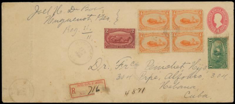 Registry Exchange Label, Jacksonville, FL, blank, no name. With ms. "716" number, bit missing, affixed on legal-size 4¢ pink (U325) entire bearing 1¢-2¢ Trans-Mississippi (285-286) singles and 4¢ Trans-Mississippi (287) block of four, each tied by four-ring target, matching "Huguenot Ga. Jan 28, 1899" cds to Havana, Cuba, Jacksonville (1.30) transit backstamp and two Havana (2.4) arrival cds; creased at left with some splitting, light overall toning, Fine and scarce Jacksonville exchange label use. Scott No. FX-JA4; $2,000. US$0 (Image)