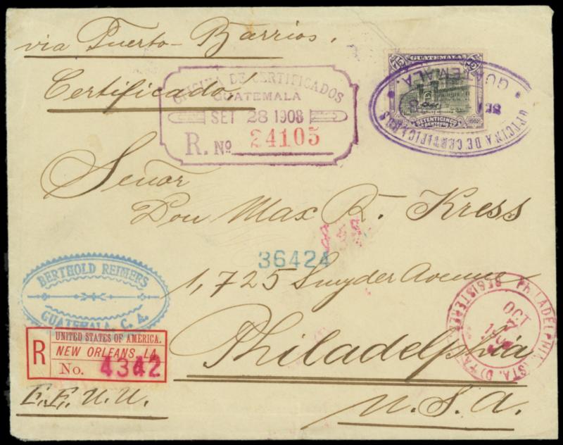 Registry Exchange Label, New Orleans, LA, printed name. Magenta "4342" number, affixed on 1908 incoming cover from Guatemala via New Orleans to Philadelphia Pa. bearing Guatemala 75c black & purple and large 10c, 12½c, 20c franking covering reverse, all tied by purple (9.28.1908) oval, reverse with New Orleans, La. (10.6) transit and Philadelphia (10.8) arrival cds, Very Fine. Scott No. FX-NO1; $600; Estimate $200 - 300. US$200-300 (Image)