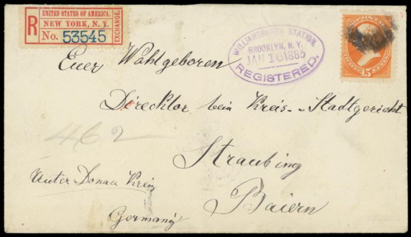 Registry Exchange Label, New York, NY, printed name. Blue "53545" handstamp, affixed on 1885 cover bearing 15¢ orange (189) tied by grid cancel, purple "Williamsburgh Station, Brookyn, N.Y., Registered. Jan 16, 1885" oval to Straubing, Germany, New York C (1.17) examiner's backstamp, Straubing (1.28) arrival backstamp, fresh and Very Fine. Scott No. FX-NY1a; Estimate $150 - 200.