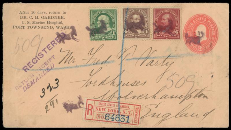 Registry Exchange Label, New York, NY, printed name. Blue "64631" handstamp, affixed on 2¢ pink fawn entire bearing 1¢ green (279), 4¢ rose brown (280) and 6¢ lake (281), each tied by strike of Kicking Mule (AN-11) fancy cancel, faint 1900 ultramarine Port Townsend, Washington Terr. registry postmark to Wolverhampton, England, purple "Registered." and "Return Receipt, Demanded" handstamps, New York (9.28) oval backstamp, "Registered, Wolverhampton" (10.7) arrival oval backstamp; some edge wear, Very Fine,ex-Landau. Scott No. FX-NY1a; Estimate $500 - 750. US$500-750 (Image)