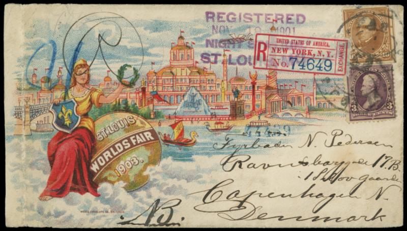 Registry Exchange Label, New York, NY, printed name. Overall illustrated St. Louis Mo. World's Fair advertising envelope bearing 3¢ purple (268) and 10¢ orange brown (283), tied by "St. Louis Mo." ovals, purple "Registered, Nov 19 1901, Night Station, St. Louis Mo." postmark to Copenhagen, Denmark, reverse with New York (11.21) transit and Copenhagen (12.3) arrival backstamp; edge and flap tears, crease at left, F.-V.F. Scott No. FX-NY1a; Estimate $150 - 200. US$150-200 (Image)