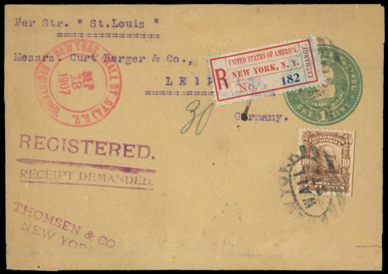 Registry Exchange Label, New York, NY, printed name. Blue "182" number, affixed on 1¢ green (W384) wrapper bearing 10¢ pale red brown (307) tied by "New York, Wall St." oval, pink "New York (Wall St Sta.) N.Y., Registered, Sep 18, 1907" cds to Germany, purple "Registered." and "Receipt Demanded" handstamps, New York (9.14) transit backstamp, Very Fine and scarce registered wrapper use. Scott No. FX-NY1a; Estimate $150 - 200. US$150-200 (Image)