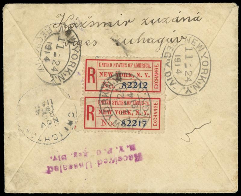 Registry Exchange Label, New York, NY, printed name. Vertical pair with blue "82212" and "82217" numbers, affixed to seal flap of 1914 cover from Hungary to Creighton Pa. bearing on Hungary, 50f carmine on blue tied by "Nagyminaly, 14 Nov 6" cds, "R, Nagyminaly" registry label, New York (11.24) transit oval backstamps with one tying exchange label seals, purple "Received Unsealed, N.Y.P.O. Reg. Div." two-line handstamp; some wear and soiling, Very Fine and scarce registered wrapper use. Scott No. FX-NY1a; Estimate $150 - 200. US$150-200 (Image)