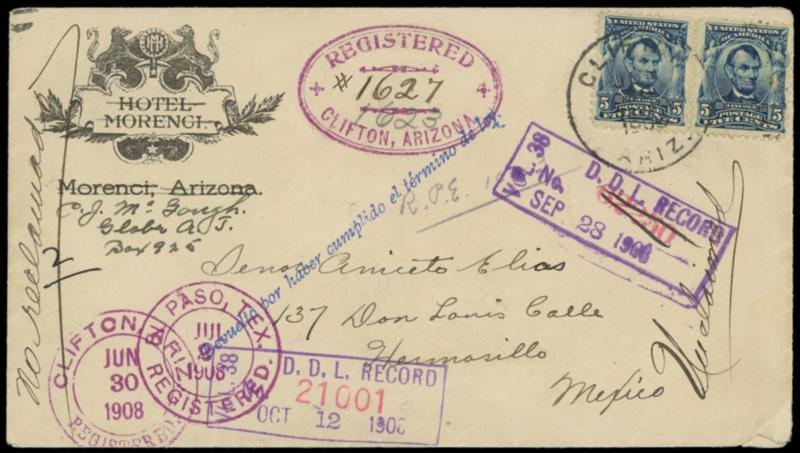 Registry Exchange Label, Nogales, AZ, printed name. Ms. "160" number, affixed on reverse of cover bearing 5¢ blue (304) pair tied by "Clifton, Ariz. Jun 30, 1908" duplex to Hermarillo, Mexico, fancy purple "Registered, Clifton, Arizona '#16627' " ova and matching "Clifton, Ariz. Registered, Jun 30 1908" cds, purple El Paso (7.2) transit cds, reverse with blue Nogales (7.4) transit, Nogales Mex. (7.4) entry and Hermosillo (7.5) arrival oval, cover not claimed and returned via D.L.O.; small bottom right corner flaw, Very Fine and scarce label. Scott No. FX-NOG1; $1,000. US$0 (Image)