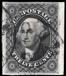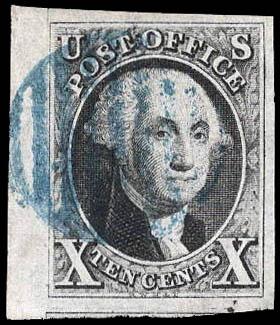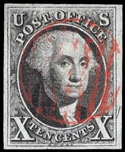 1847, 10¢ Washington, black (Scott 2), red grid cancel, Extremely Fine. Scott $850. Estimate $500 - 750. Scott $850 Suggested Bid $500-750 (Image)