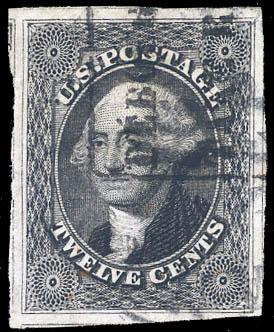 1851, 12¢ Washington, gray black (Scott 17), 4 large to huge margins including parts of the next stamp at left and sheet margin at right, town cancellation, Very Fine, with 2025 P.F. certificate graded VF 80. Scott $260. Estimate $180 - 240. Scott $260 Suggested Bid $180-240 (Image)