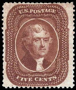 1861, 5¢ Jefferson, orange brown, type II (Scott 30), unused without gum, Very Fine, with 1984 and 2025 P.F. certificates, the latter graded VF 80. Scott $575. Estimate $350 - 500. Scott $575 Suggested Bid $350-500 (Image)