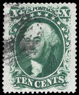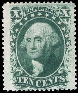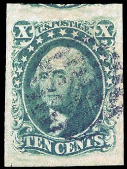 1859, 10¢ Washington, green, type V (Scott 35), a beautifully well centered gem, o.g., barest trace of hinge, Very Fine to Extremely Fine, with 1991 P.F. certificate. Scott $210. Estimate $120 - 180. Scott $210 Suggested Bid $120-180 (Image)