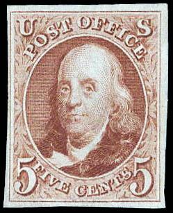 1847 (1875 Reproduction), 5¢ Franklin, red brown (Scott 3), 4 mostly large margins, a light purple handstamp on reverse, without gum as issued, Very Fine and choice, with 1984 P.F. certificate. Scott $1,000. Estimate $600 - 800. Scott $1,000 Suggested Bid $600-800 (Image)