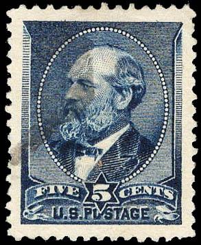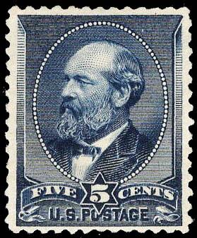 1888, 5¢ Garfield, indigo (Scott 216), lovely centering and bright fresh color, o.g., hinged, Very Fine. Scott $220. Estimate $150 - 200. Scott $220 Suggested Bid $150-200 (Image)