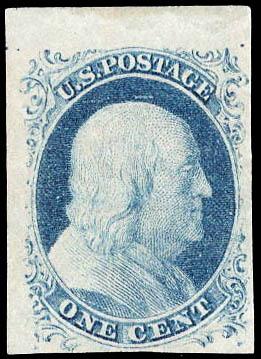 1852, 1¢ Franklin, blue, type IV (Scott 9), position 1L1L, large to huge margins including top sheet margin, rich color, o.g., hinged, Extremely Fine, with 2024 P.F. certificate graded XF 90, rarely seen this nice! Scott $725. Scott Stamp Values $1,650. Estimate $1,000 - 1,500. Scott $725 Suggested Bid $1,000-1,500 (Image)