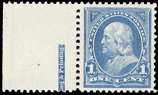1890, 1¢ Franklin, dull blue (Scott 219), part imprint single, o.g., never hinged, Extremely Fine. Scott $70. Estimate $100 - 150. Scott $70 Suggested Bid $100-150 (Image)