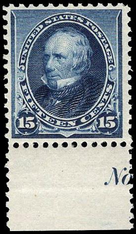 1890, 15¢ Clay, indigo (Scott 227), part imprint single, o.g., never hinged, Very Fine, with photocopy of 1988 P.F. certificate for block. Scott $625. Estimate $350 - 500. Scott $625 Suggested Bid $350-500 (Image)