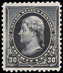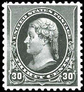 1890, 30¢ Jefferson, black (Scott 228), razor sharp impression and wonderfully well centered, o.g., never hinged, Very Fine to Extremely Fine, with 1978, 1998, 2005 and 2012 P.F. certificates, the last graded VF-XF 85. Scott $900. Scott Stamp Values $1,175. SMQ $1,750. Estimate $1,000 - 1,500. Scott $900 Suggested Bid $1,000-1,500 (Image)