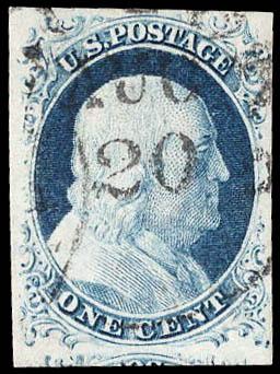 1852, 1¢ Franklin, blue, type IV (Scott 9), position 81R1L, huge margins on all sides, even showing part of the adjacent stamp at bottom, town cancel, Extremely Fine, with 2000 and 2025 P.F. certificates, the latter graded XF 90, a narrow-margined issue that is rarely seen so nice. Scott $100. Scott Stamp Values $275. Estimate $150 - 200. Scott $100 Suggested Bid $150-200 (Image)