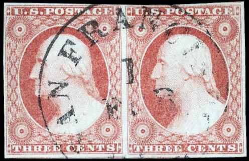 1852, 3¢ Washington, dull red, type II (Scott 11A), position 29-30R, horizontal pair, socked-on-the-nose San Francisco, CA circular date stamp cancel, Very Fine, with 2014 P.S.A.G. certificate graded VF 80. Scott $63. Estimate $40 - 60. Scott $63 Suggested Bid $40-60 (Image)