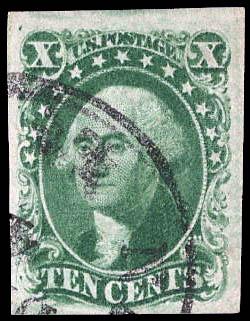1855, 10¢ Washington, green, type II (Scott 14), black town cancellation, Extremely Fine, with 1980 P.F. certificate. Scott $145. Estimate $150 - 200. Scott $145 Suggested Bid $150-200 (Image)