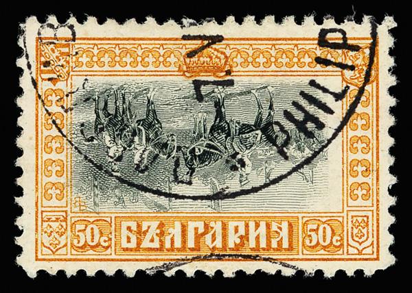 1911, 50s Tsar and Princes, center inverted (Scott 97a), Post Office fresh with clean color on pristine paper, the Tsar & Princes turned upside down; partial strike of bilingual Plovdiv/Philippople c.d.s. as found on all existing examples, Very Fine, signed Karaivanoff and Bloch. Michel 86 K. Scott $4,250.