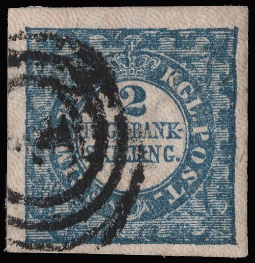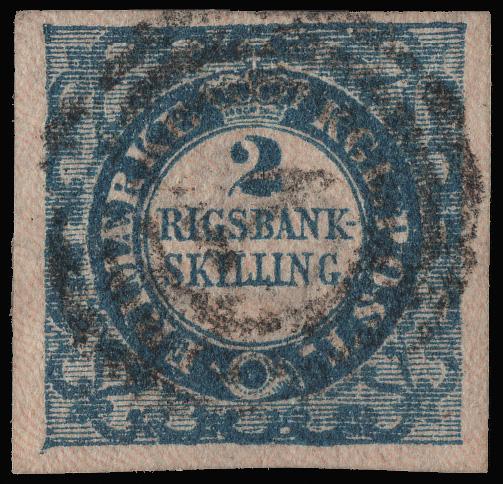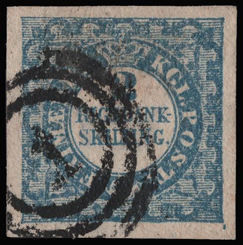 1851, First Issue, 2rs blue, 1st (Ferslew) printing (Scott 1a), clear to mostly large margins with a light, but unclear Copenhagen "1" cancel, Fine to Very Fine. Michel 2 I. Facit 1 I. Scott $2,400. (Image)