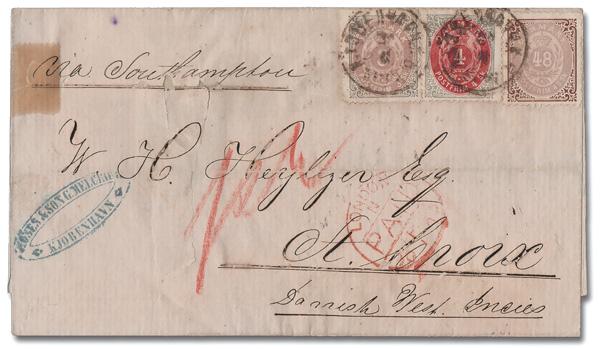 1870, Crowned Numeral, 48sk brown & lilac, perf. 12½ (Scott 24), used with 3s & 4s perf 14x13½ (17, 18), tied together on a folded cover to St. Croix, D.W.I. by Copenhagen c.d.s.s with a red London PAID transit c.d.s. and a red crayon rating; dates of postmarks not legible but docketed 24 June 1875 (not backstamped); somewhat fragile with some sealed internal tears and ink erosion, but still quite an attractive and very scarce 3-color franking. Michel 21B. Facit 27; SKr 20,000 ($1,940). Scott $2,400+. (Image)
