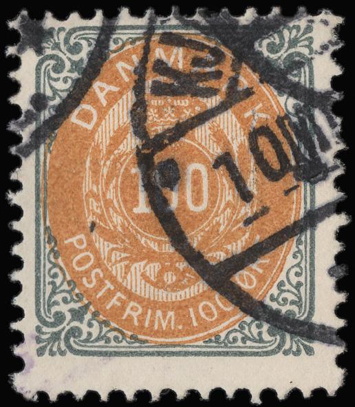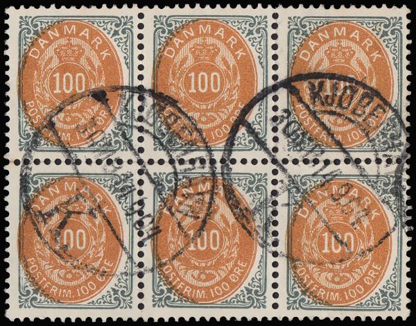 1903, Crowned Numeral, 100øre slate & orange, new watermark type III (Scott 52c var.), the bottom three stamps in a horizontal block of 6, the top three with normal frame; fresh and well centered with two neat Copenhagen c.d.s.s, 14 Sep 1904, Very Fine. A marvelous showpiece. Michel 31BZ var. Facit 45bb. Facit SKr 7,200 as singles ($700). (Image)