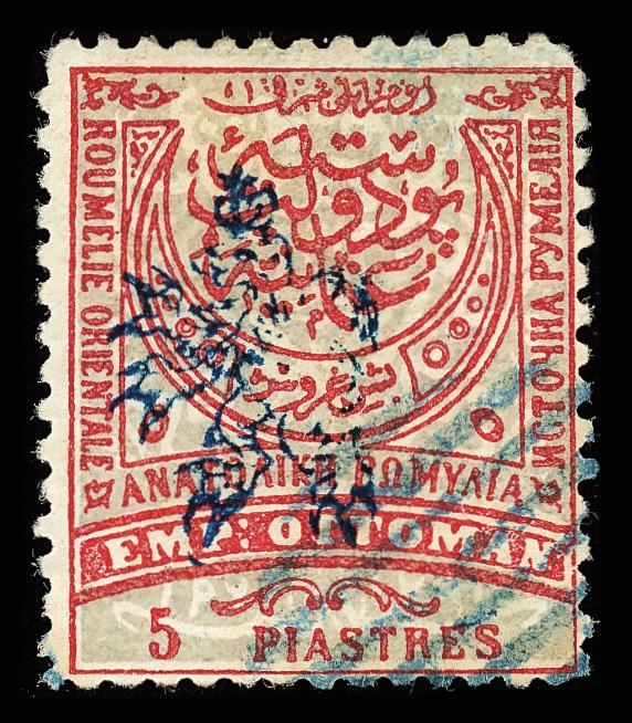 1885, 5pi rose & blue, blue overprint (Scott 24), attractive high value with strong color and faint blue grid cancel; slightly rounded corners at right, Fine to Very Fine, unpriced (dashed) as used in Scott (mint $1100). (Image)