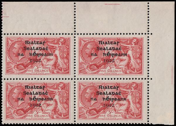 1922, Dollard Provisional Govt. overprint on 2s6s & 5s "Seahorse2" (Scott 12-13), upper right corner margin blocks of 4, o.g., upper left 2s6d and upper left & lower right 5s never hinged, Very Fine. SG 17, 19. Scott $910+. (Image)