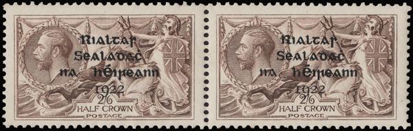 1927, Free State overprint 2s6d "Seahorse", wide date, missing accent on "a" (Scott 77b & var.), horizontal pair, the right stamp without the accent, o.g., lightly hinged. SG 86, 86b; £500 ($640). (Image)