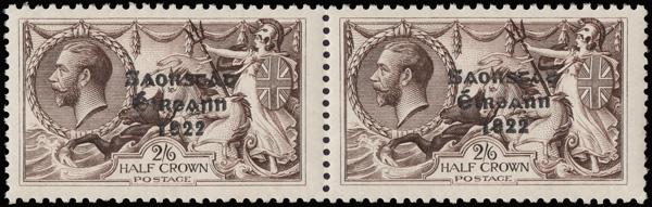 1922, Thom Provisional Govt. overprint on King George V "Seahorse", 2s6d sepia brown (Scott 36), a pristine horizontal pair, o.g., never hinged, post office fresh and virtually perfectly centered, Extremely Fine. SG 44. Scott $1,000+. (Image)