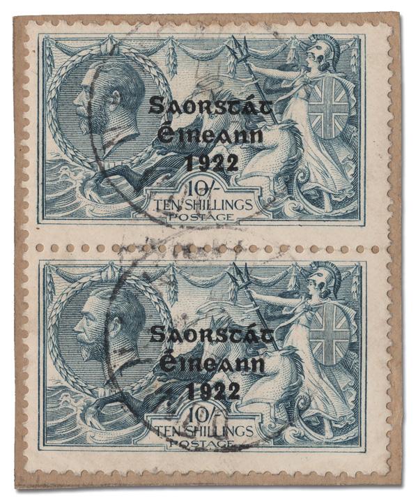 1928, Free State overprint on 10s "Seahorse", wide date (Scott 79b), vertical pair, lightly canceled on a small piece; bottom stamp with a light corner bend at the lower left, Fine to Very Fine. Very scarce. SG 88. Scott $850+. (Image)