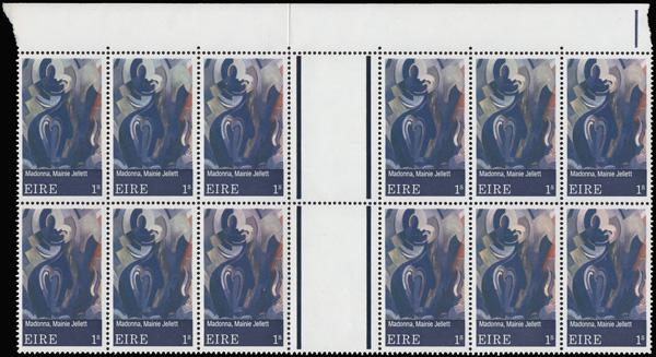 1970, 1s Madonna of Eire, pink color (background) omitted (Scott 283 var.), gutter block if 12 with a normal gutter block of 8 for comparison, o.g., never hinged, Extremely Fine. A rare unlisted Error. SG 280 var. (Image)