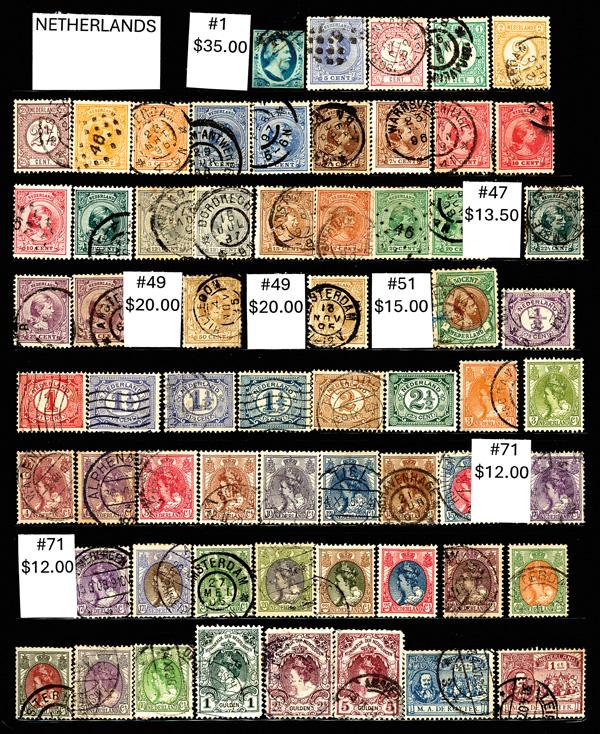 Netherlands, Dutch Treat 1852-1950, 650+ mixed mint and used from Holland on 5 black stock pages; items range from #1//330, B1//B215, C1//C11, and J1//J79; includes #1, 47, 49 (2), 51, 71 (2), 95, 176, 190, B4-B5, B6-B8, B16-B20, B37-B40, B41-B43, B44-B47, B123-B128, B129-B133, B208-B212, J1-J4, J43c, and J67; catalog $1,100, Fine to Very Fine. (PDF for this Lot) (Image)
