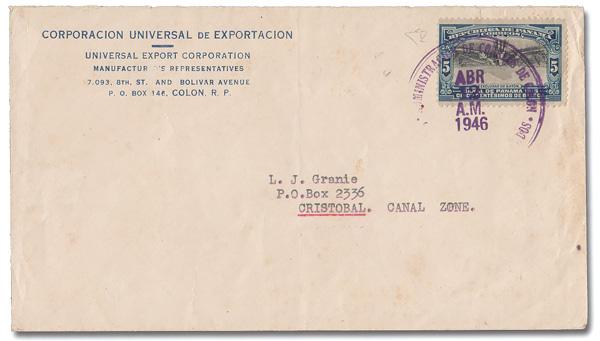 1915, Panama-Pacific Exposition, 5c with inverted center (Scott 210a), tied by a partial Colon c.d.s., Apr 12, 1946, on a cove to Cristobal, C.Z.; backstamped with the same marking; envelope bears the corner card of the Universal Export Corp. in Colon; central vertical file fold, Fine to Very Fine. Exceedingly rare on cover., signed En. Diena, with his 1980 certificate. Scott $650. (Image)