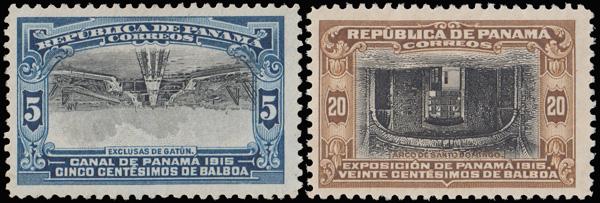 1915, Panama-Pacific Exposition, 5c & 20c with inverted centers (Scott 210a, 212a), 5c without gum, 20c o.g., lightly hinged, Fine to Very Fine. Scott $1,800. (Image)