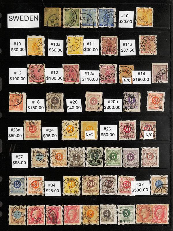 Sweden, Quality Mini Collection, 1858-1944, 400 almost all postally used on black stock pages; items run from #6//355, B6//B50, C6//C8c, J1//J22, and O1//O55; includes #10 (2), 10a, 11, 11a, 12 (2), 12a, 14, 18, 20, 20a, 23a, 24, 26, 27, 34, 37, 203-209, 212, 216-218, 220, 248-262, 319-321, J1, J4, J6, J10, J11, O1, O2, O16, O23, and O27, Fine to Very Fine. Scott $3,800+. (PDF for this Lot) (Image)