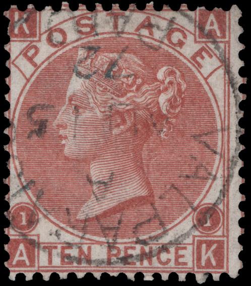 GREAT BRITAIN USED IN VALPARAISO, CHILE, 1867, 10p RED BROWN PLATE 1, #53, fine-very fine (Image)