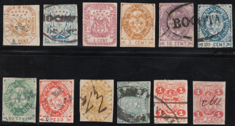 COLOMBIA, 1863-66 GROUP OF CLASSIC ISSUES, #24//49, twelve diff. stamps, few flaws, overall fine-very fine (Image)