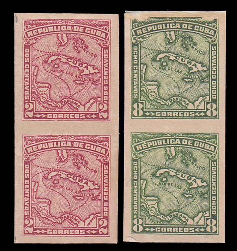 CUBA, 1914, 2c CAR ROSE & 8c GREEN IMPERF VERTICAL PLATE PROOF PAIRS ON CARD STOCK, #254P &258P, 8p part design missing error at top plate, fresh and very fine (Image)