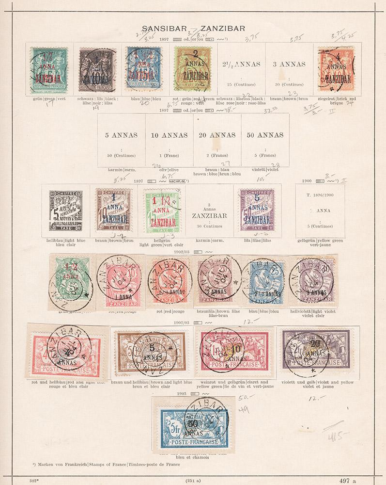 FRANCE, OFFICES IN ZANZIBAR, 1897-1903 ISSUES USED ON ALBUM PAG CV $415E, incl. nos. 1-4, 7, 39-49, J2-J3, J5, fine-very fine, cat. $415.00 (Image)