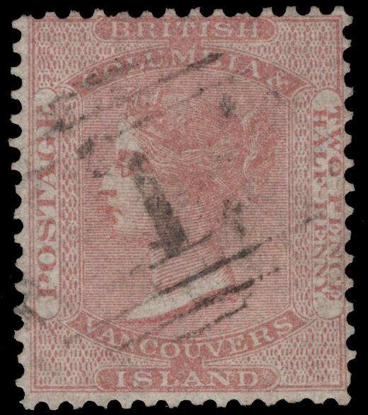 BRITISH COLUMBIA, 1880, 2½p DULL RED PERF 14 USED, #2, numeral "1" cancel, fine-very fine, cat. $350.00 (Image)