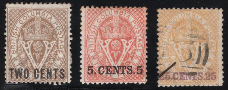 BRITISH COLUMBIA, 1867-69 SURCHARGE ISSUE GROUP, #8-9, 11, 2c/3p and 5c/3p unused, 25c/3p used, fine, cat. $1,035.00 (Image)
