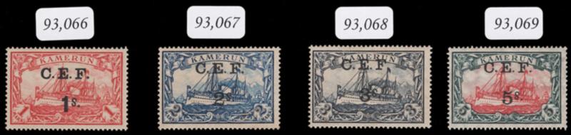CAMEROUN - BRITISH OCCUPATION, 1915 1sh on 1m to 5sh on 5m YACHT SURCHARGES, "S" INVERTED MINT, #62a-65a, matched "set" from pos. 12, bold colors, lightly hinged, 2sh tiny thin spots, very fine, 1sh and 3sh signed Champion, 5sh signed Buhler, each with 2019 BPA cert., cat. $4,725.00, Gibbons B10a-B13a @ £4,300.00, Gibbs 10a-13a, only 100 were printed, very rare matched set (Image)