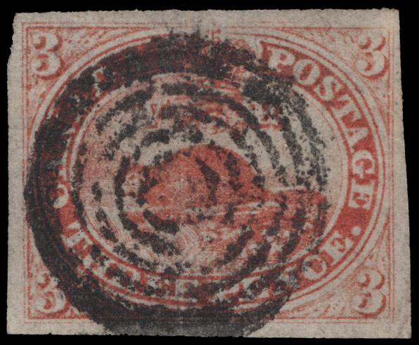 CANADA, 1851, 3p RED ON LAID PAPER USED, #1, full margins, target cancel, vertical crease, very fine, cat. $1.120.00 (Image)