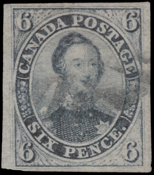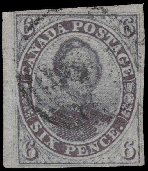 CANADA, 1851, 6p SLATE VIOLET ON LAID PAPER USED, #2, full margins, just touching at top left, tiny diagonal crease at bottom right, fine-very fine, with PSAG cert., cat. $1,400.00 (Image)
