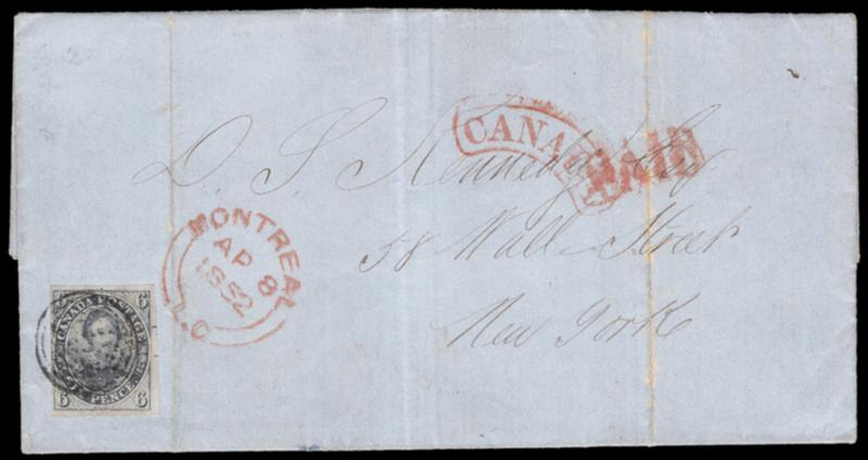 CANADA, 1852, 6p SLATE VIOLET ON LAID PAPER ON COVER, #2, full margins, tiny diagonal corner crease at bottom right, tied by mute concentric circle cancel, red Montreal d.s., on Apr., 1852 folded letter to New York, red 'CANADA" in arc and Paid h.s., fine-very fine, with 2025 PSAG cert., cat. $2,100.00 (Image)